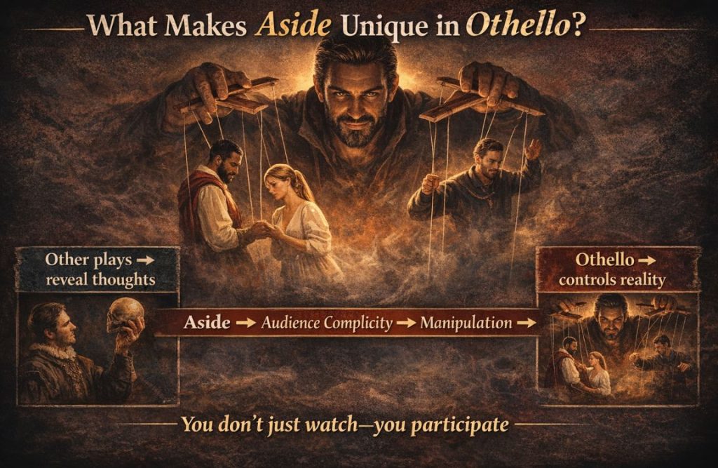 Let me explain the function of aside in Othello the way I do in class- think of it as a spotlight revealing what others cannot see. These brief lines expose hidden motives before actions unfold, allowing us to anticipate conflict. This is why the importance of aside in Othello goes beyond style. It actively shapes the tragedy.
