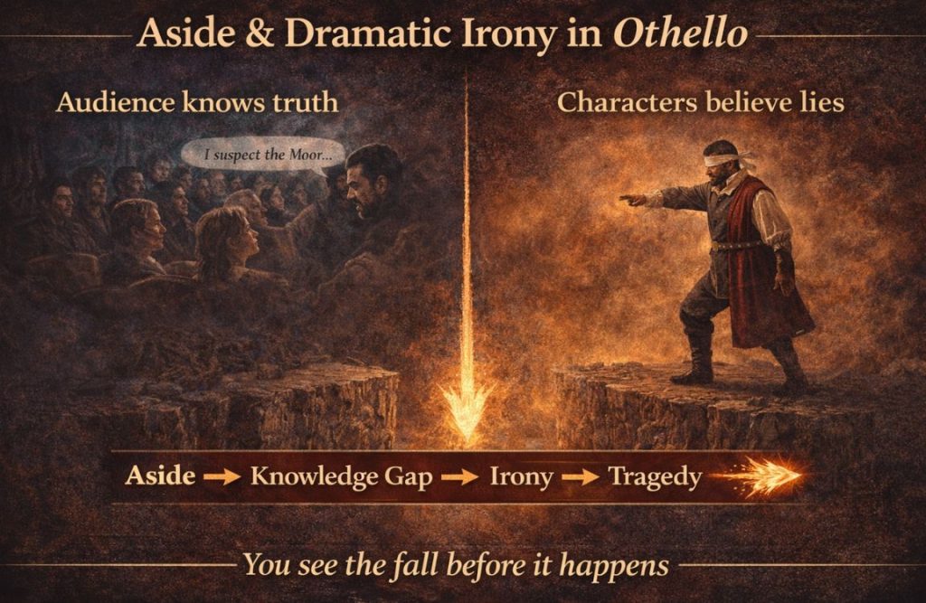 Asides also foreshadow action and build suspense by showing how plots unfold before they happen. Unlike soliloquies, they are short and occur within ongoing dialogue. So, an aside in Othello is not just a technique. It sharpens irony, builds trust with the audience, and intensifies tragedy in a uniquely dramatic way.