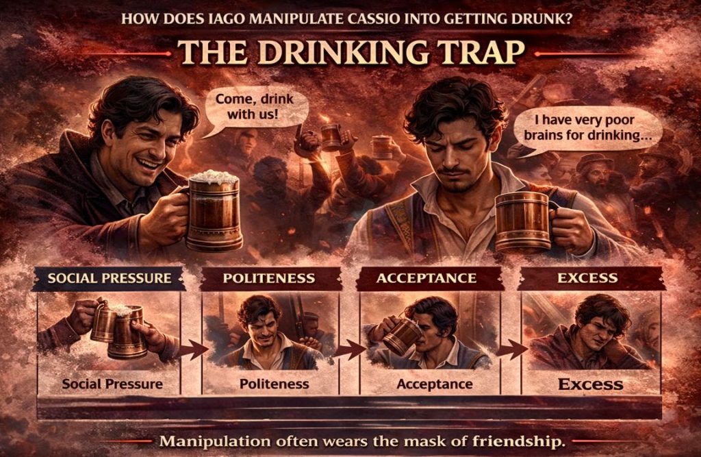 So, how does Iago get Cassio drunk? Not by force, but through social pressure. During the Cyprus celebration in Act 2, Scene 3, Iago encourages drinking, sings songs, and involves others, making refusal feel impolite. And Cassio, ever courteous, gives in.