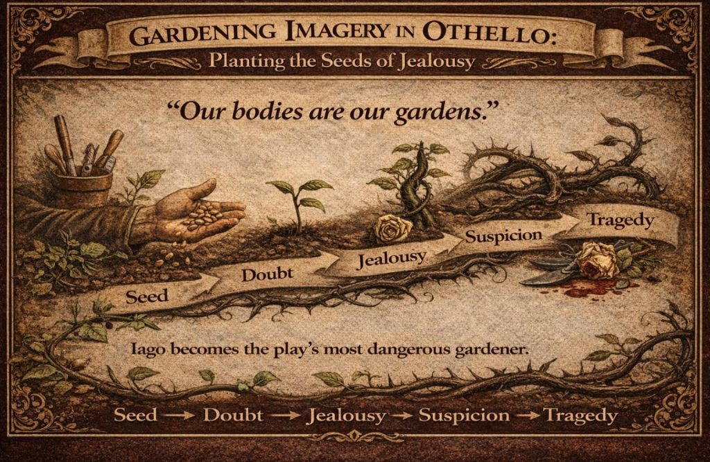 The gardening imagery motif in Othello appears in Iago’s line, “Our bodies are our gardens.” It suggests that human character grows from the seeds people choose to plant- virtue, jealousy, or deception- revealing how manipulation gradually cultivates tragedy.