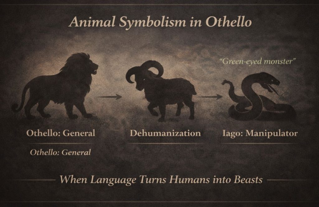 The animal symbols in Othello strip characters of humanity. Shakespeare loads the dialogue with insults and creature metaphors so the audience feels moral decay before it becomes visible action- a powerful case of imagery and symbolism in Othello, shaping emotion.